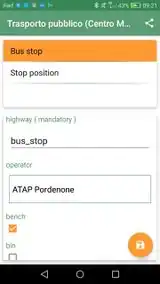 - First form item defining the mandatory OSM highway=bus_stop and some ancillary elements (shelter=yes|no, bench=yes|no, bin=yes|no) and finally a pool of operators.