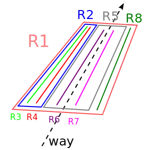 - Die Spuren in diesem Versuch eines Datenmodells gehen von links nach rechts in Richtung des Wegs. Wenn man die Richtung eines Wegs umdreht, sollte ein Editor nachfragen, ob er die Reihenfolgen und Richtungen der lanes mitdrehen soll oder nicht.