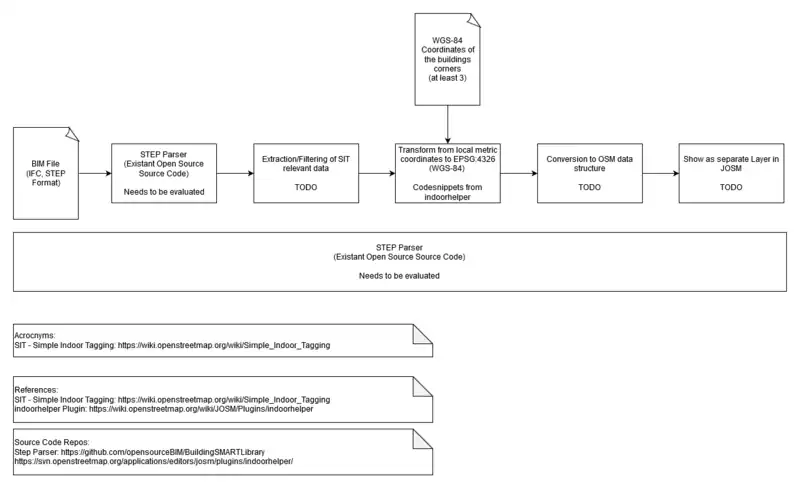 Within this project an already existing JOSM plugin named IndoorHelper got extended by a function to import and translate BIM (Building Information Modeling) data. The imported data fits into the SIT schema.