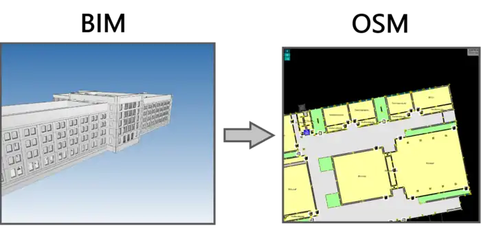 - Internal data structure holding IFC data will be converted to OSM objects (using defined translation schema)