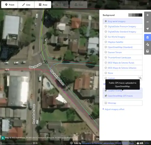 - desenhar remotamente sobre materiais disponibilizados no OSM por terceiros (como imagens de satélite, mapas, fotos e/ou traçados de GPS).