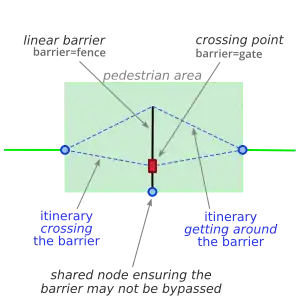 A routing engine handling area routing should consider linear barriers located partially or fully inside a pedestrian area, or at the junction between two pedestrian areas. Whether a barrier can be crossed may vary depending on the pedestrian profile.