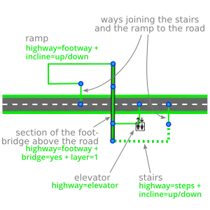 A stairway is mapped as a way with the tag highway=steps, an elevator is a node with the tag highway=elevator. A ramp is a highway=footway holding the tag incline=*. These objects must be connected top and bottom to the shared and distinct ways they join.