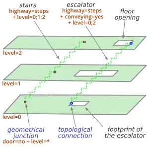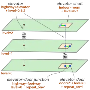 An elevator or lift is defined by a node highway=elevator, where the tag level=* describes the served levels, either as a list of values (i.e. level=1;2;4) or as in interval (i.e. level =-1-4). A geometrical junction is defined between the elevator node and the pedestrian areas surrounding it and sharing the same level=*.