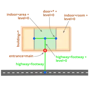 level=*value of indoor ways is consistent with theindoor=*areas where they are located in or connected to. - Connect indoor ways to the doors
