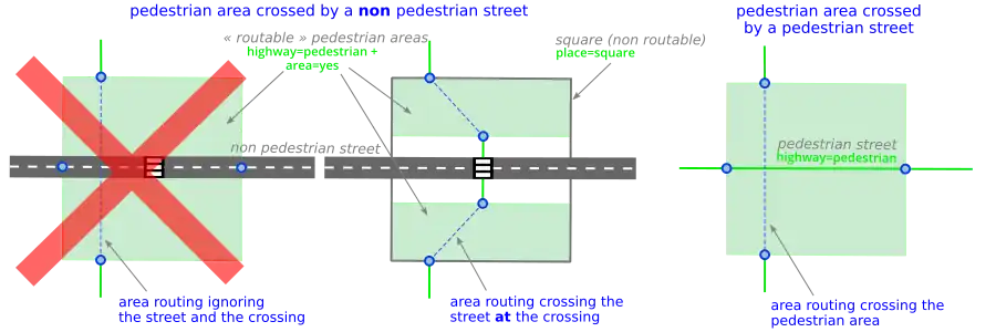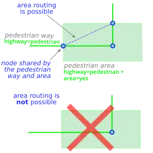 In order to enable routing engines to combine linear and area routing, it is essential to connect ways to the pedestrian areas they cross or get to. The connection between a way and an area is a node shared between the two objects – see the diagram Connecting a way to a pedestrian area.