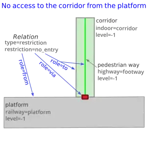 Note that the from and to members can be pedestrian areas (a platform, an indoor corridor, a pedestrian area, etc.). Also several members can have the same role, including the intersection members, for instance if an entrance is mapped with several adjacent doors.
