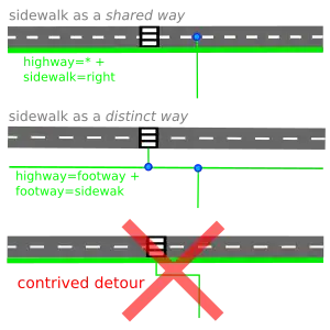 sidewalk:both=separate,sidewalk:left=separate, orsidewalk:right=separateto the carriageway it borders, depending on which side or sides of the street have a separately mapped sidewalk. This prevents mappers from describing the sidewalk twice. - Avoid distorting a pedestrian way to connect to a crossing: this could result in inconsistent detours when producing itineraries. See the diagram Connecting a way with no contrived detour.