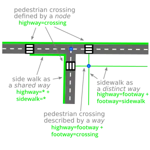 A pedestrian crossing is defined by a node tagged with highway=crossing and shared with the way that defines the carriageway. In addition it can be described with a way highway=footway + footway=crossing joining one or several distinct ways. Crossings shared with cyclists are described on the page footway=crossing.