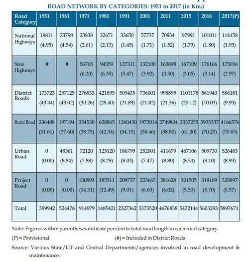 Indian road network is administered by various government authorities, given India's federal form of government. The following table shows the total length of India's road network by type of road as on 31 March 2017.