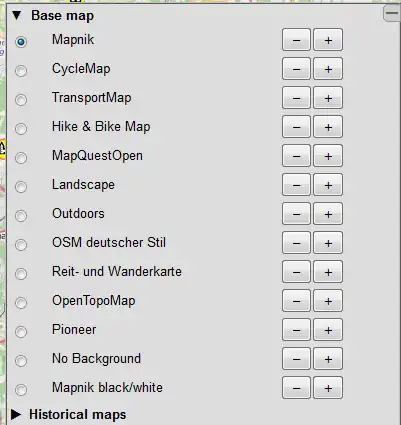 The base map is the background map style, it defaults to the classic OpenStreetMap Mapnik style. Select to your convenience. Only one base map can be selected at a time.