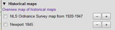 An increasing number of historical maps is available as overlays. The maps shown depend on the current map area. Only historical layers that are visible in the current map area are shown in the layer changer. The link "Overview map of historical maps" opens up a new window with all historical maps available in a graphical representation.