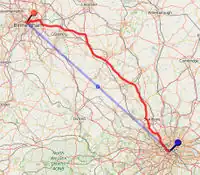 The measuring tool allows to determine the length of a path that may be created by clicking in the map. It can also be activated through clicking F9 key. The length is shown in the lower left part just above the attribution. The ESC key clears the current path. Clicking on the length info field pops up a small tutorial and also offers the option to download the path in several formats. (Currently only in German).