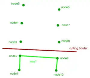 Cutting without SRTM2OSMsegmenter and without --complete-ways![]() Image 2 shows what happens: node3 to 8 are outside the cutting area and will be removed by the cutting. Their node refs in way1 become broken refs. The rendering process ignores these broken refs and assumes that node2 is followed by node9 and therefore draws an artifact connecting node2 and node9. | |