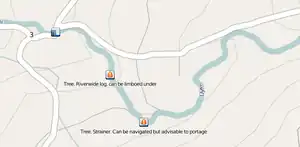 Openstreetmap (e le persone che contribuiscono alla mappa) non accettano responsabilità per danni, incidenti o morti causate dall'aver seguito le informazioni che appaiono nelle mappe o nei dati derivate da queste. La sicurezza negli sport d'acqua può essere appresa al meglio solamente in corsi riconosciuti.