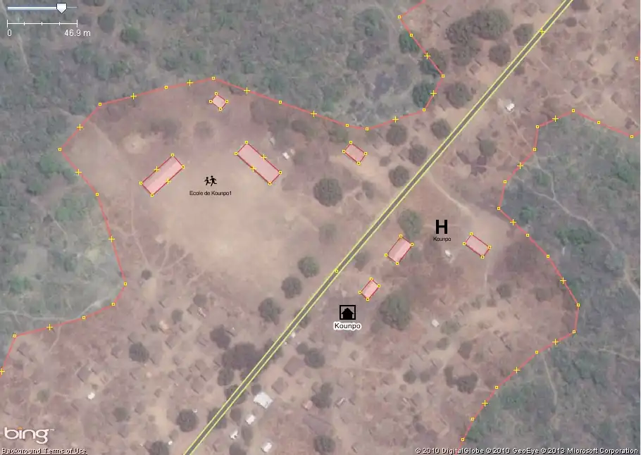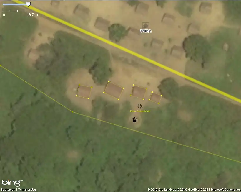 Location is this time less obvious as it is not related to building but wells. Lots of examples are provided below. Sometimes there is no obvious well close to the node; it is better in that case to let the node at its original location. If the water point is part of a health facility or a school, it will generally be located at the exact same location. It is better to move one of them so that they do not overlap each other. If nothing is obvious, better to slightly move the school of health facility node, as they do not represent the exact location of a small object anyway. See below an example.