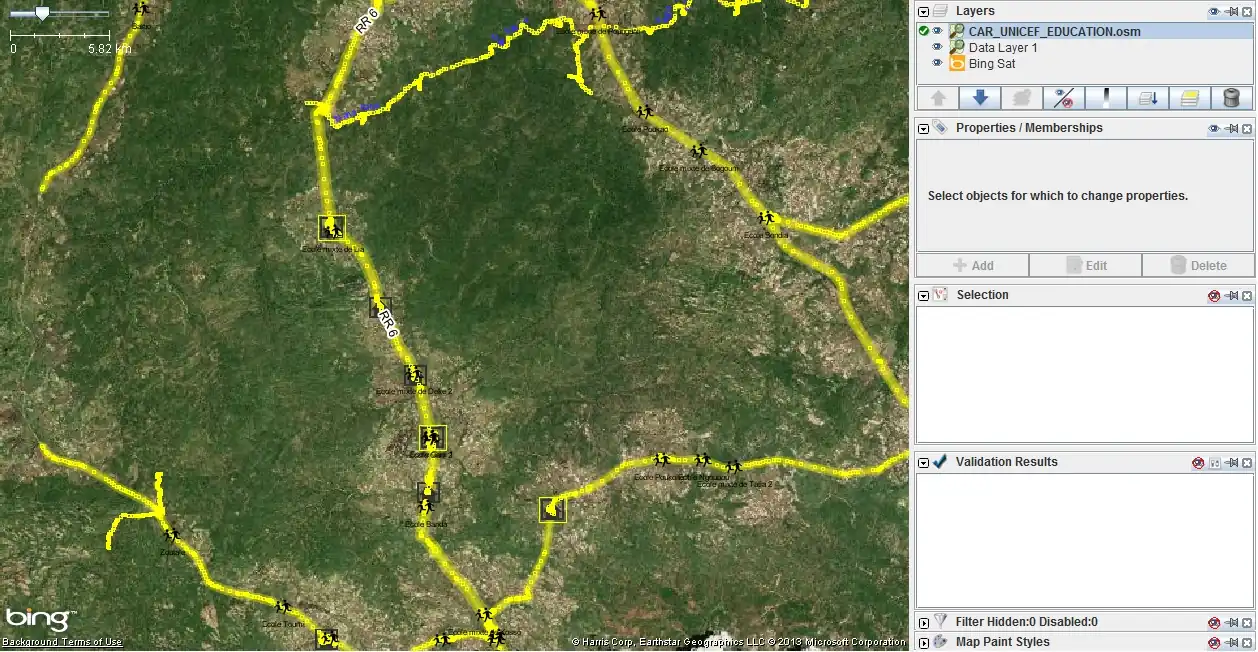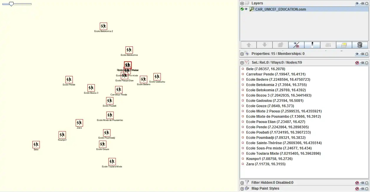 This is a very interesting aspect of the UNICEF data: every object has a addr:city=* tag. As a huge majority of settlements are missing in OSM, it is a great opportunity to add them in OSM. It is even far more detailed than the settlements layers that can be found in the OCHA Common Operational Datasets (this one being, unfortunately, made from unknown source and consequently cannot be added into OSM). In CAR, most of them are villages, sometimes towns. The NGA . The NGA (National Geospatial-Intelligence Agency) country files layer for Central African Republic, in .osm format, can be downloaded here. This data is ODbL compatible.