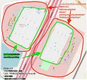 既存の amenity=parking ポリゴンに対して、SA/PAと同じ名前が入っていることがあります。