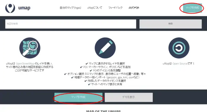 - ホームページ (https://umap.openstreetmap.fr/ja/) に移動して「マップを作成」をクリック。
