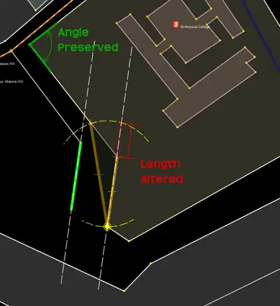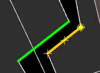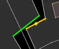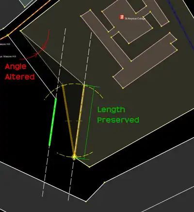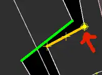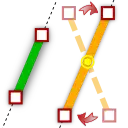 You will also notice yellow crosshairs on the two ends of the segment and in the centre of it. These are the potential rotation points or pivots that the segment can rotate around in order to become parallel with the reference segment. By default the centre pivot point is active and this is marked with the yellow dot-and-circle.