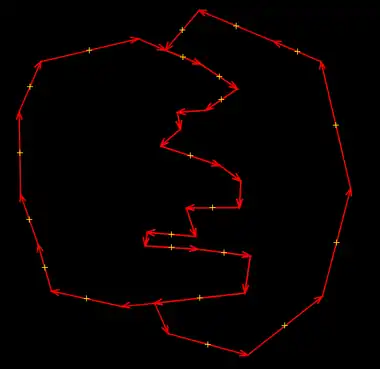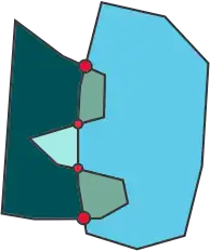 An special case is then contours have more than one overlapped section (exists more than two intersection points). In these case plugin action must redraw the non-priority contour border to the priority contour border in overlapped section (between even and odd intersection points). In overlapped section the priority contour border is redrawn to the non-priority contour border (between odd and even intersection points).