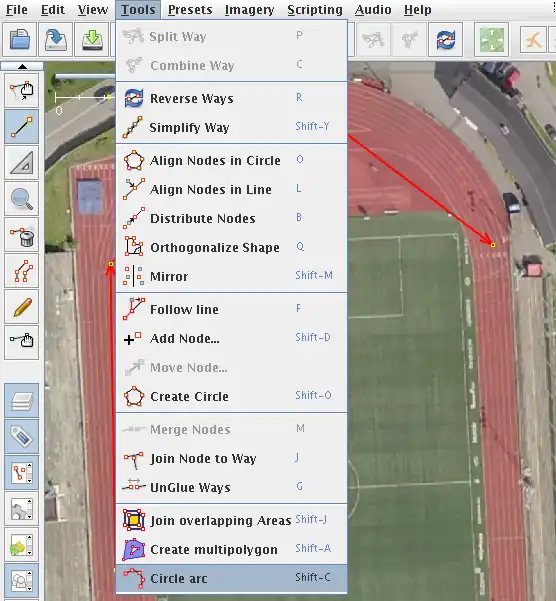 - One way and 3 nodes (in that way) selected: The arc is "fused" into the selected way at the position of the selected nodes.