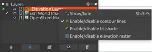 In the layer manager, right click on the elevation visualization layer opens a context menu which allows enabling and disabling the options as desired.