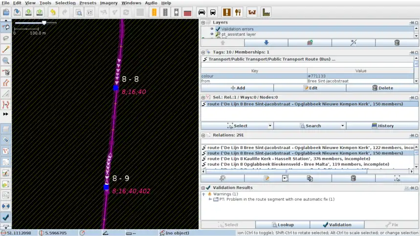 | 11 | PT: Problem in the route segment with one automatic fix | The ways between two consecutive stops (as listed in the route relation) are not continuous. This may be for a variety of reasons: segments absent or unnecessary segments present, wrong sorting, unsplit ways, etc. | The ways of the route segment (i.e. the part of route between two consecutive stop) are substituted with ways from the corresponding correct segment or from the ways that constitute the given route. JOSM zooms in to the problem. | darya |