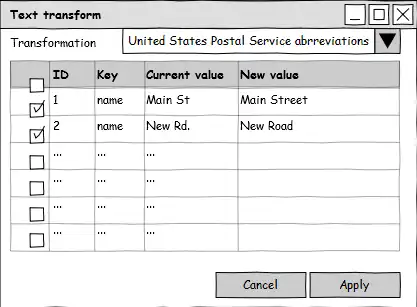 The GUI mockups above give an indication of what the dialog would look like. The plugin will only consider selected objects, so we can take advantage of all the powers of JOSM's built-in search tool. "Transformers" will themselves be plugin-like, or at the very least implement a common base class. A simple signature might be OsmObject transform(OsmObject input), as it could then perhaps automatically filter by region, or ignore objects with a certain ID number, last author, version, etc.