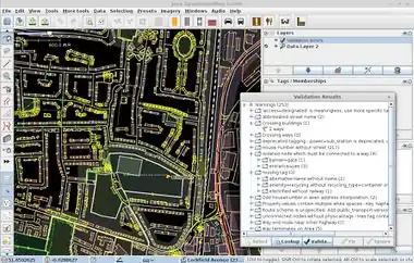 | Crossing ways | Checks for ways (with highway/railway/waterway tags) that crosses in same layer with no crossing node | Add appropriate layer (and possibly bridge or tunnel) | |
