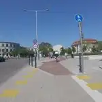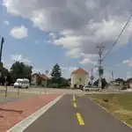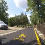 Jó minőségű, térkővel burkolt, sávok nélküli, elég keskeny osztott kerékpárút, az elválasztást színes térkő jelöli (belterületen)
