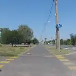 Jó minőségű, aszfaltos, sávok nélküli, kivilágított, osztott kerékpárút, az elválasztás felfestéssel jelölve (külterületen)