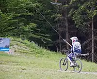 A T-bar lift that does not allow bicycle transport but takes cyclists on their bikes.