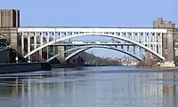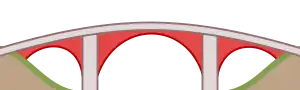 | arch | In an arch bridge, the span is supported by a curved arch, which transfers some of its weight into horizontal thrust against the abutments. |