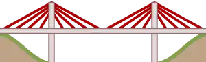 | cable-stayed | A bridge where the load is supported by cables radiating from the tops of towers resting on supports along the line of the bridge. |