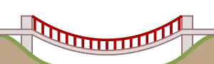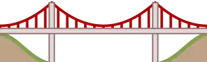 | suspension | A bridge where the load is supported from a cable under tension, attached to anchorages at each end of the bridge. In most, but not all, suspension bridges, the cables are suspended between towers near each end of the bridge. |