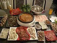 | hotpot | A meal of slices of meat or vegetables cooked in a heated pot on the table | ||