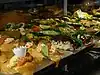 | buffet | A restaurant serving food from a shared table that is dished out to each diner | ||