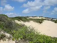 Hills or ridges of loose sand, piled up by the wind, with little or no vegetation. |