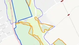 Layer tags used incorrectly for woods and a golf course. The woods are on layer 2, a golf course on layer -1 and a common on layer -2. These features are all at ground level and will render correctly without layering. |