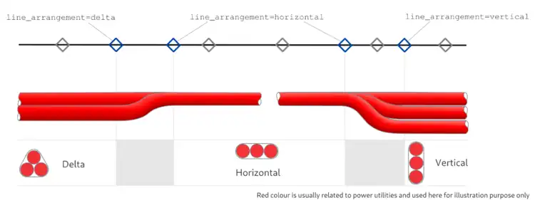 Then, it is optional to use =* on any node and recommended on node where arrangement is changing along cables' path. Arrangements can change near of particular way points: when going through a bridge, a delta arranged cable can punctually be horizontally arranged to fit in the bridge for instance.