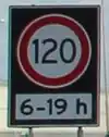 The speed is limited to 120 km/h from 6 AM to 7 PM, but the default of 130 km/h applies otherwise (example from Dutch motorway). Note that |