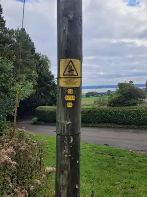 Low voltage power poles will regularly have identifying numbers attached to them, these numbers contain the site ID of the transformer or substation where the power line originates and a pole number. These numbers will be arranged over 3 lines with the first line containing 2 digits, 2nd line containing 4 digits and the 3rd line contain 3 digits. For example: