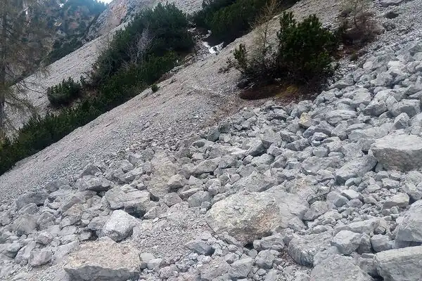 T3 | Obstacles like boulders. Exposed areas ordinarily secured with fixed ropes or chains. Use of hands for balance potentially needed. | Portions of the route exposed with danger of falling. Trail may have unmarked portions and cross fields of loose scree or talus. |