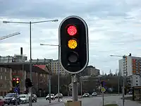 Normally off or blinking yellow and changes to red to give priority to a tram. If it is turned off in normal state, it may first blink yellow before changing to red. At some places it has only two lamps (yellow and red) instead of three. In other regions, all states are white with different shapes conveying priority. | 📈 | |||