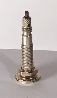 | Schrader | Code: AV. The Schrader valve / Car valve is commonly found on cars, motorcycles, and many bicycles. It is a robust valve design with a wider opening, which makes it easier to use with high-volume air pumps. The valve consists of a threaded stem into which a valve core is inserted and can be opened or closed by depressing a central pin. |