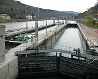 A lock chamber outline: a part of river, canal or lake system, level of which can be manipulated. The mapping of a lock and its parts is described on wiki-site lock=*.
