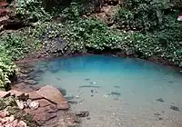 A cenote: a deep natural well or sinkhole, especially in Central America, formed by the collapse of surface limestone that exposes groundwater underneath. |