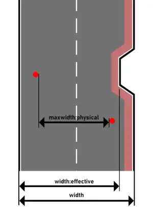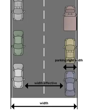 The effective usable width of a road can also be derived from other tags, in particular the total width of the carriageway minus the width of parking lanes, cycle lanes and shoulders (see also: Key:width#Width_of_streets).