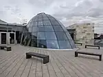 This is that same skylight, from the inside. Steel allows large spans, without a grid of supporting tubes and cables. |